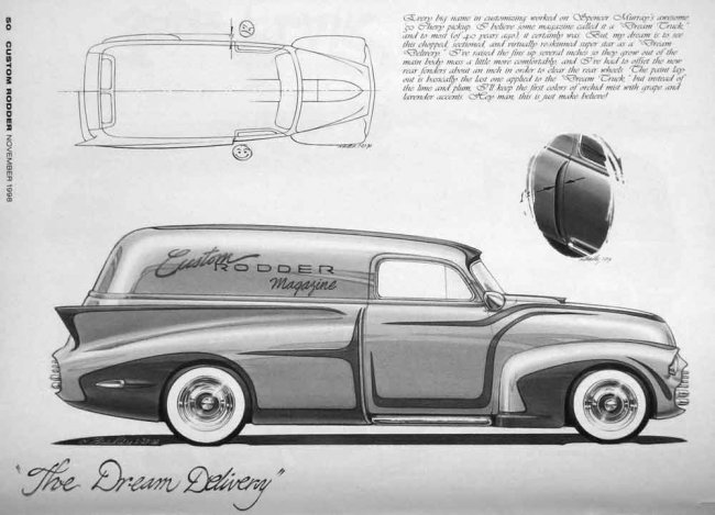 There is a lot of creativity and interesting design to be discovered when designers apply their skills and interest to modifying what Detroit built. The customizer must have a very thorough understanding of the vocabulary of forms he’s working with to successfully reinvent the design. Plus, custom cars aren’t modeled in clay first. They are skillfully built in metal, a very unforgiving medium. Harry doesn’t merely create concept sketches; he also provides details on how the modifications would be executed.