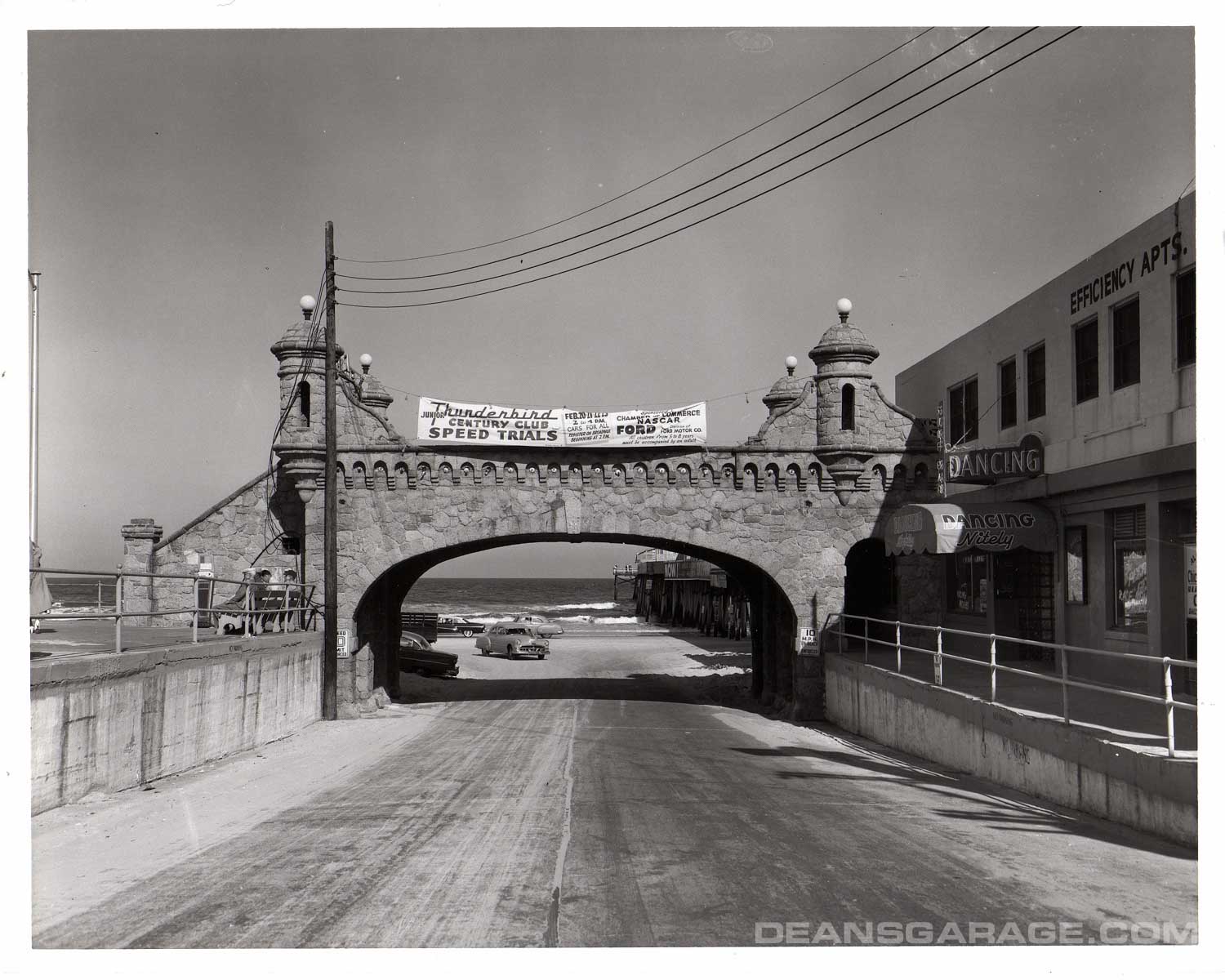 Back in the day when these photos were taken there were very few structures or homes south of Daytona Beach along A1A. Access to the beach was easy and there were numerous entrances and cuts in the dunes. This is one of the fancier entrances in the city at the end of Main Street. Note the Ford banner announcing the “junior” Thunderbird speed trials for 5- to 8-year-olds. This structure still stands at the end of Main Street.