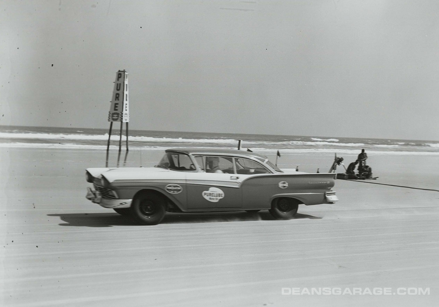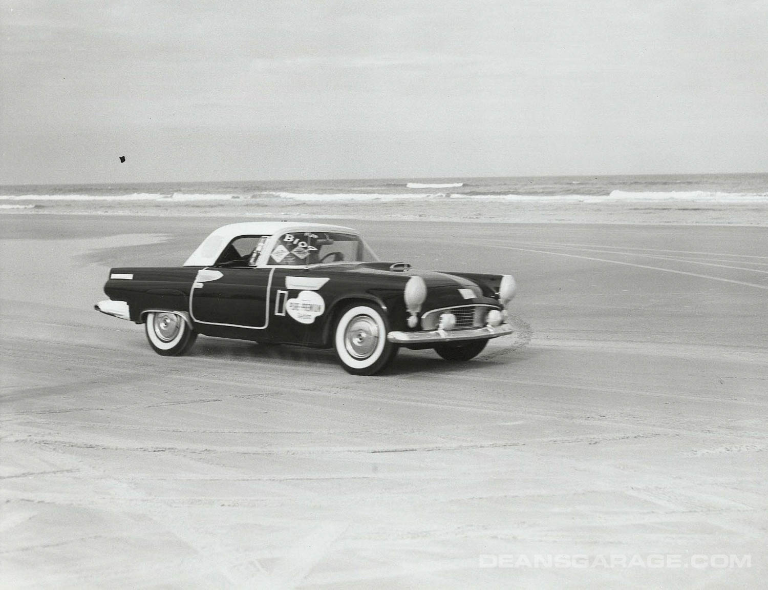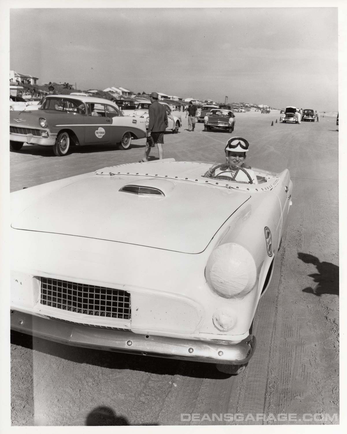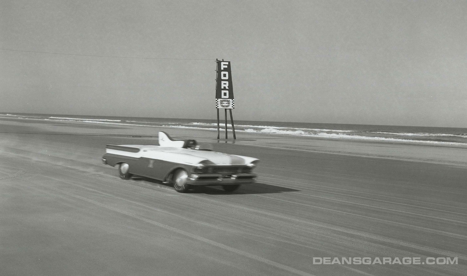 Above we have a much more modified ’56 with just a small Perspex racing windshield and spun aluminum Moon style wheel covers. From the big signpost we can tell that Ford was an active sponsor. The tide must be going out as there is still a sheen of water on the sand and wheel tracks in it as well. A north to northeast wind and receding tide were the essential elements to a smooth glass racing surface.
