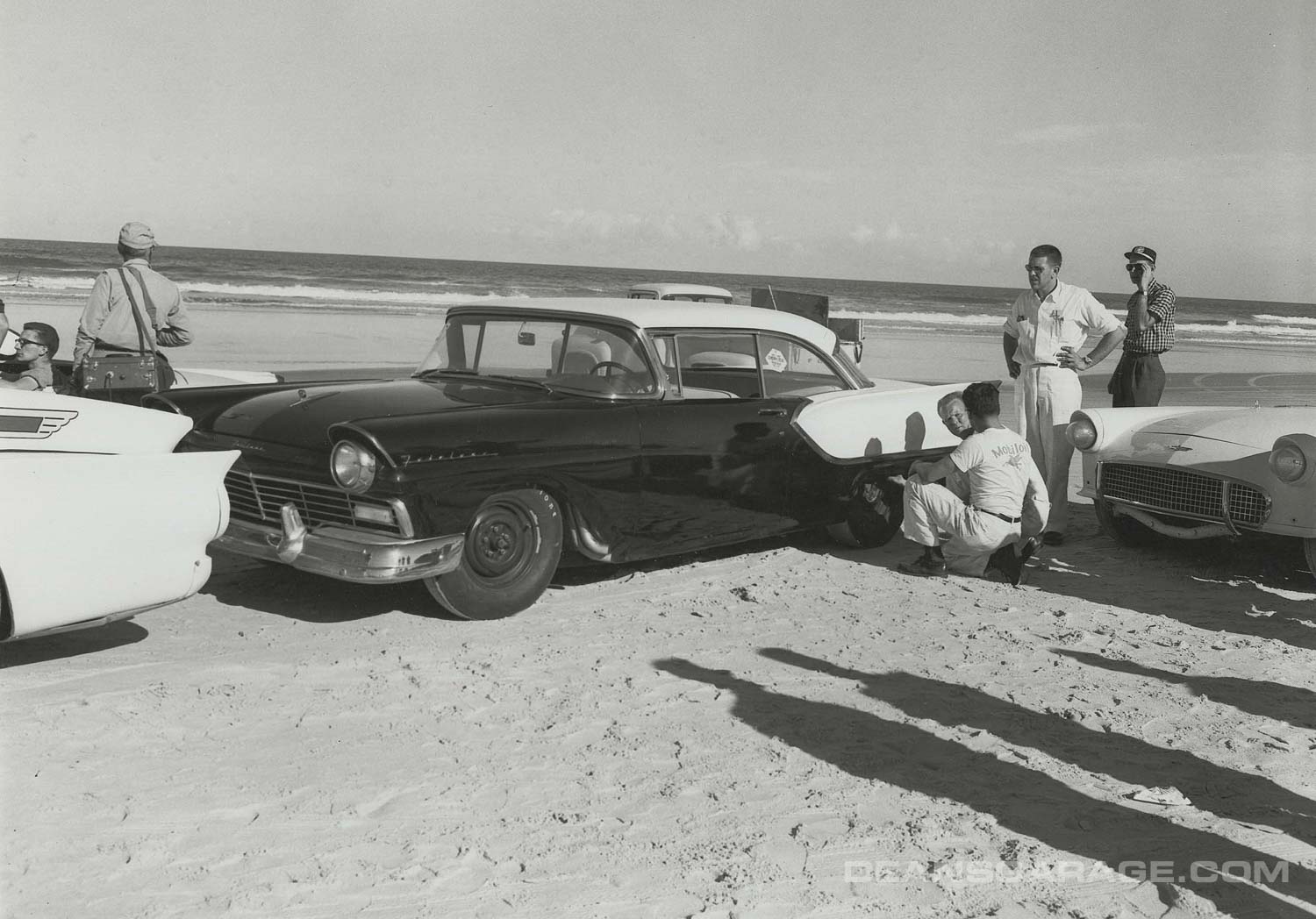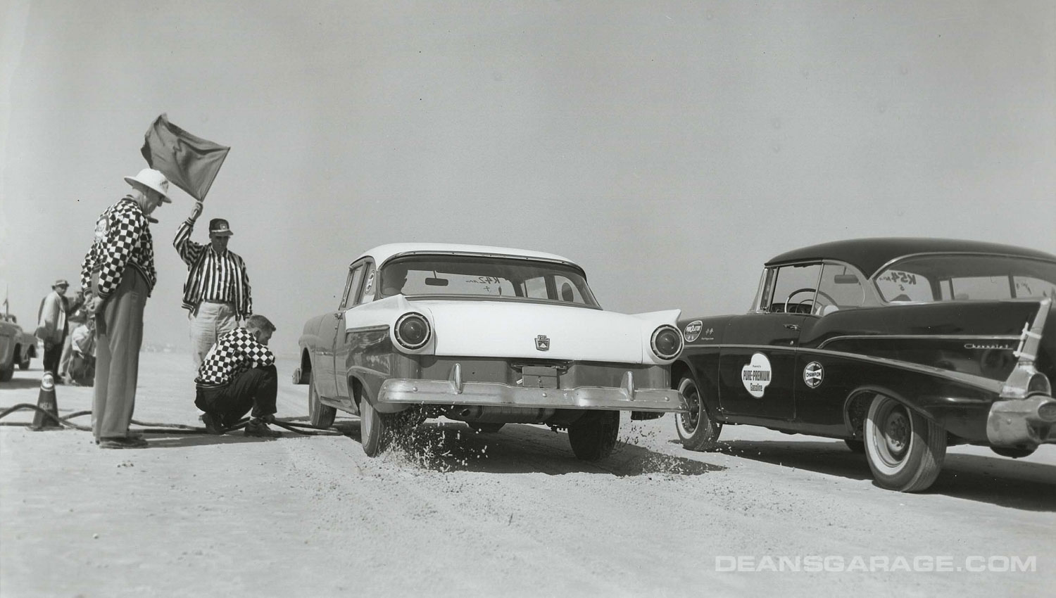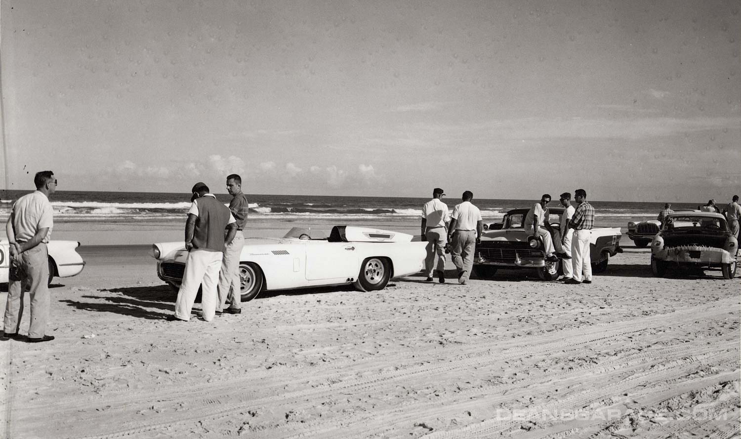 Above we have a much more modified ’56 with just a small Perspex racing windshield and spun aluminum Moon style wheel covers. From the big signpost we can tell that Ford was an active sponsor. The tide must be going out as there is still a sheen of water on the sand and wheel tracks in it as well. A north to northeast wind and receding tide were the essential elements to a smooth glass racing surface.