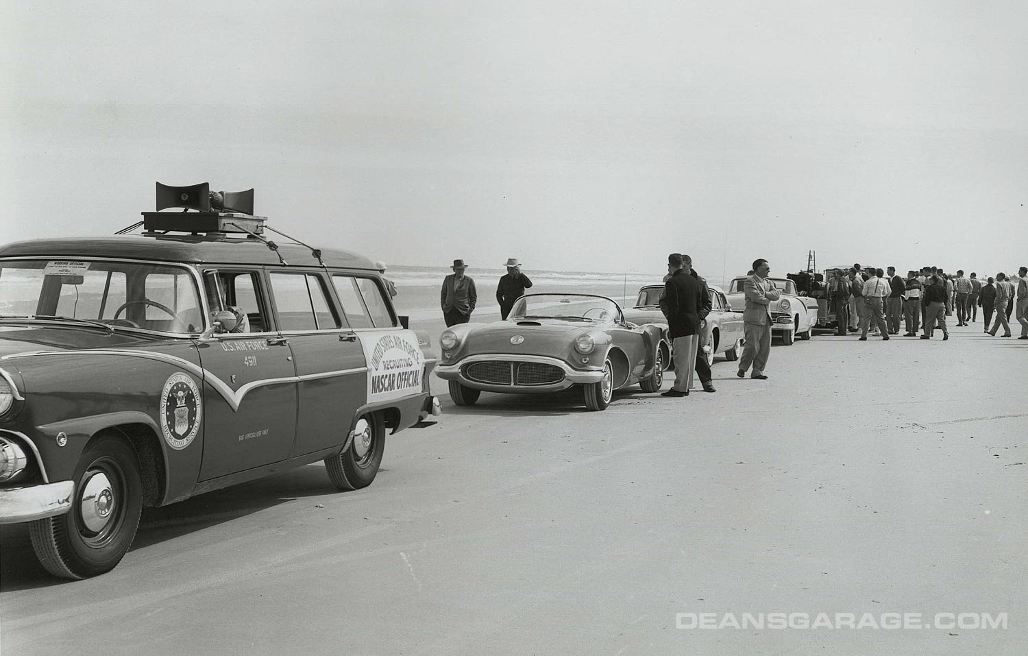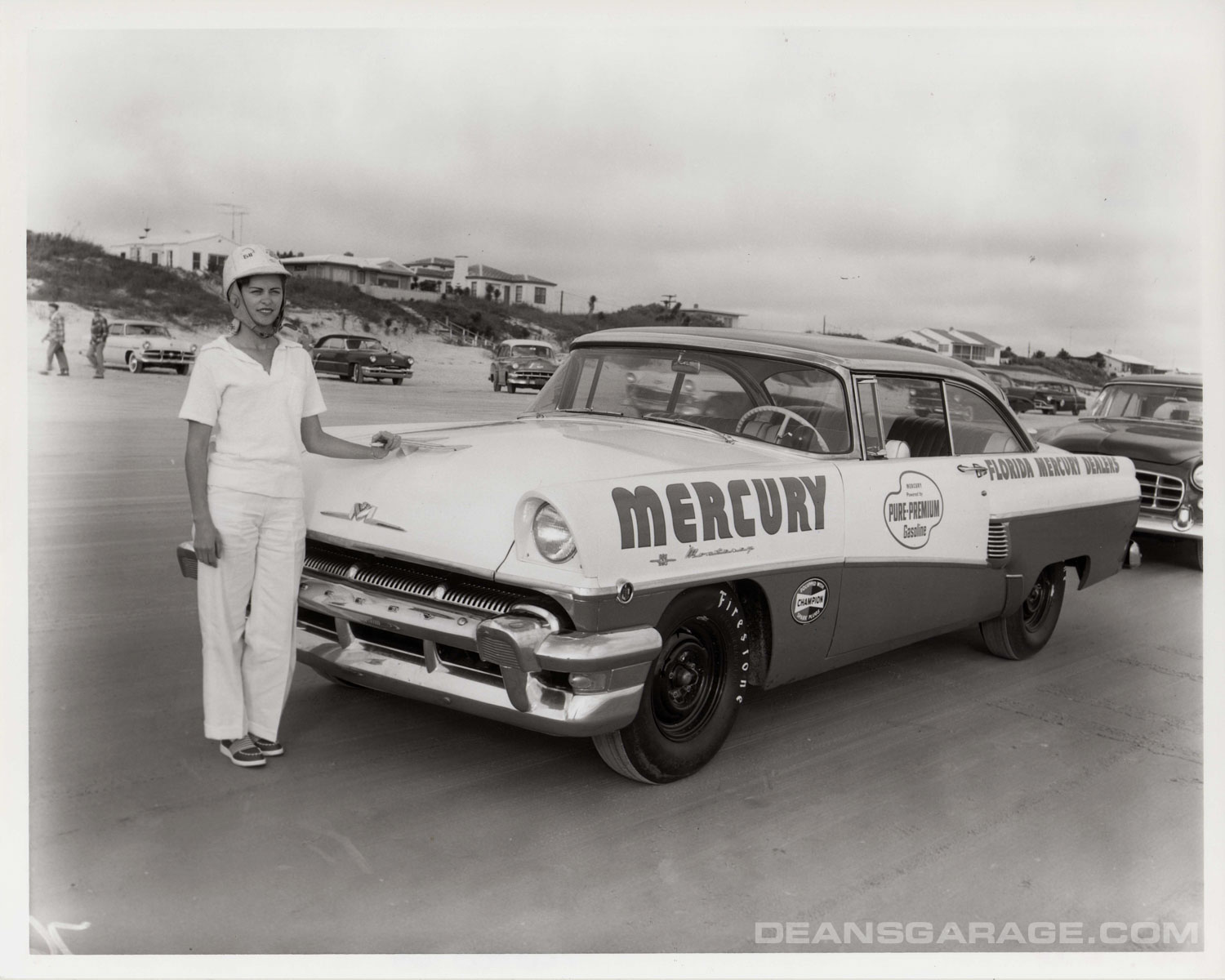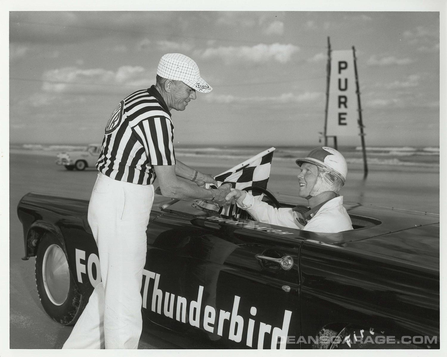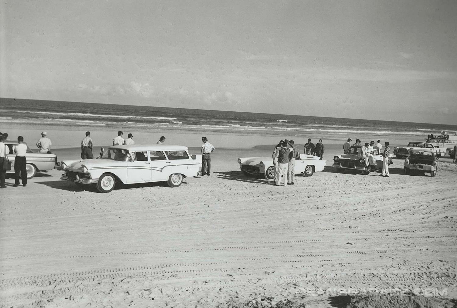 Above we have a much more modified ’56 with just a small Perspex racing windshield and spun aluminum Moon style wheel covers. From the big signpost we can tell that Ford was an active sponsor. The tide must be going out as there is still a sheen of water on the sand and wheel tracks in it as well. A north to northeast wind and receding tide were the essential elements to a smooth glass racing surface.