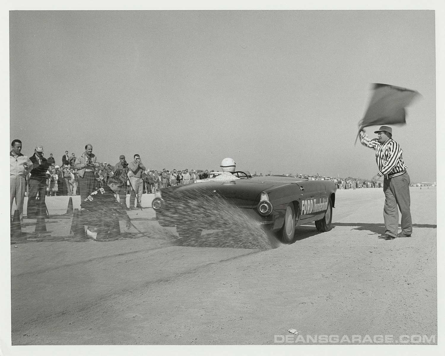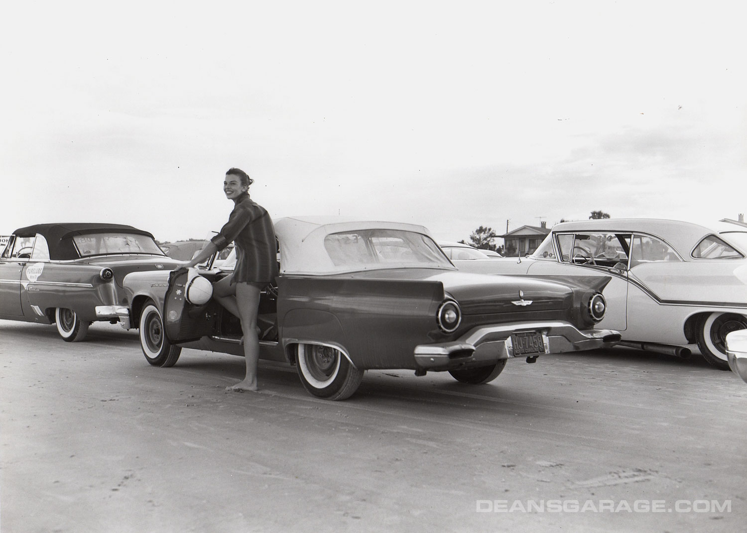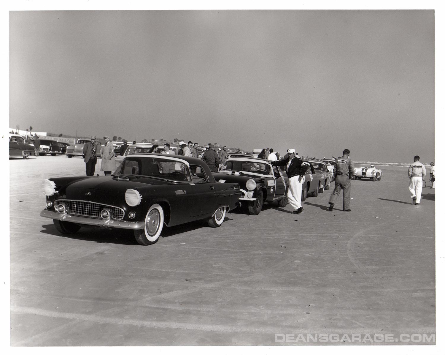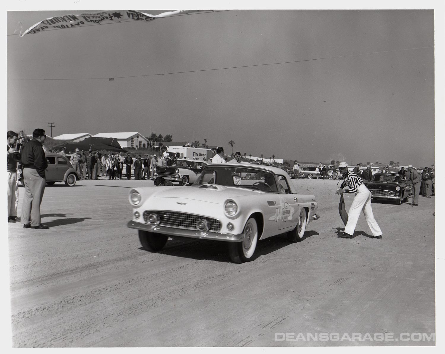 Here we see at the starting line a totally stock Colonial White ’56 Thunderbird with its stock wheel covers still in place. Note in the background how sparsely populated the housing was. Today the scene is saturated with very high-rise condominiums. Note also the Firestone truck in the background as even tier one suppliers were interested in the proceedings.