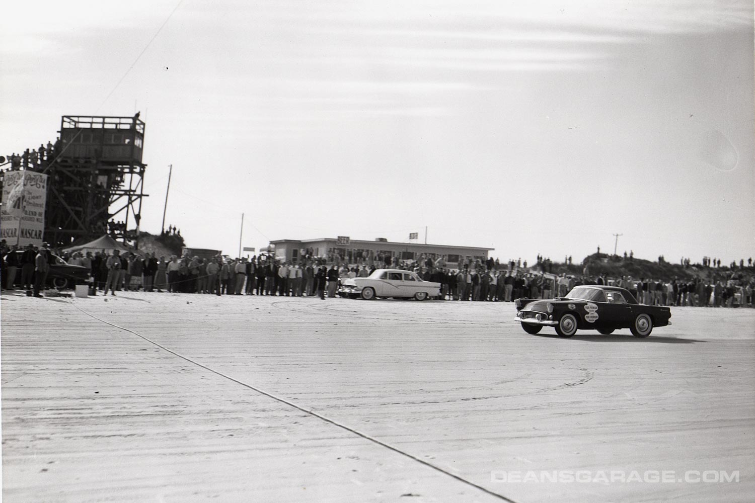 This taped up ’55 at speed is in front of the North Turn Bar. Note the “Beer” sign above the ’56 Fairlane Club Sedan. And just to the left (due south) of the bar are the north turn grandstands of the Beach-Road Course. To the north of the North Turn Bar there is nothing more than sand dunes and a few houses off in the distance.