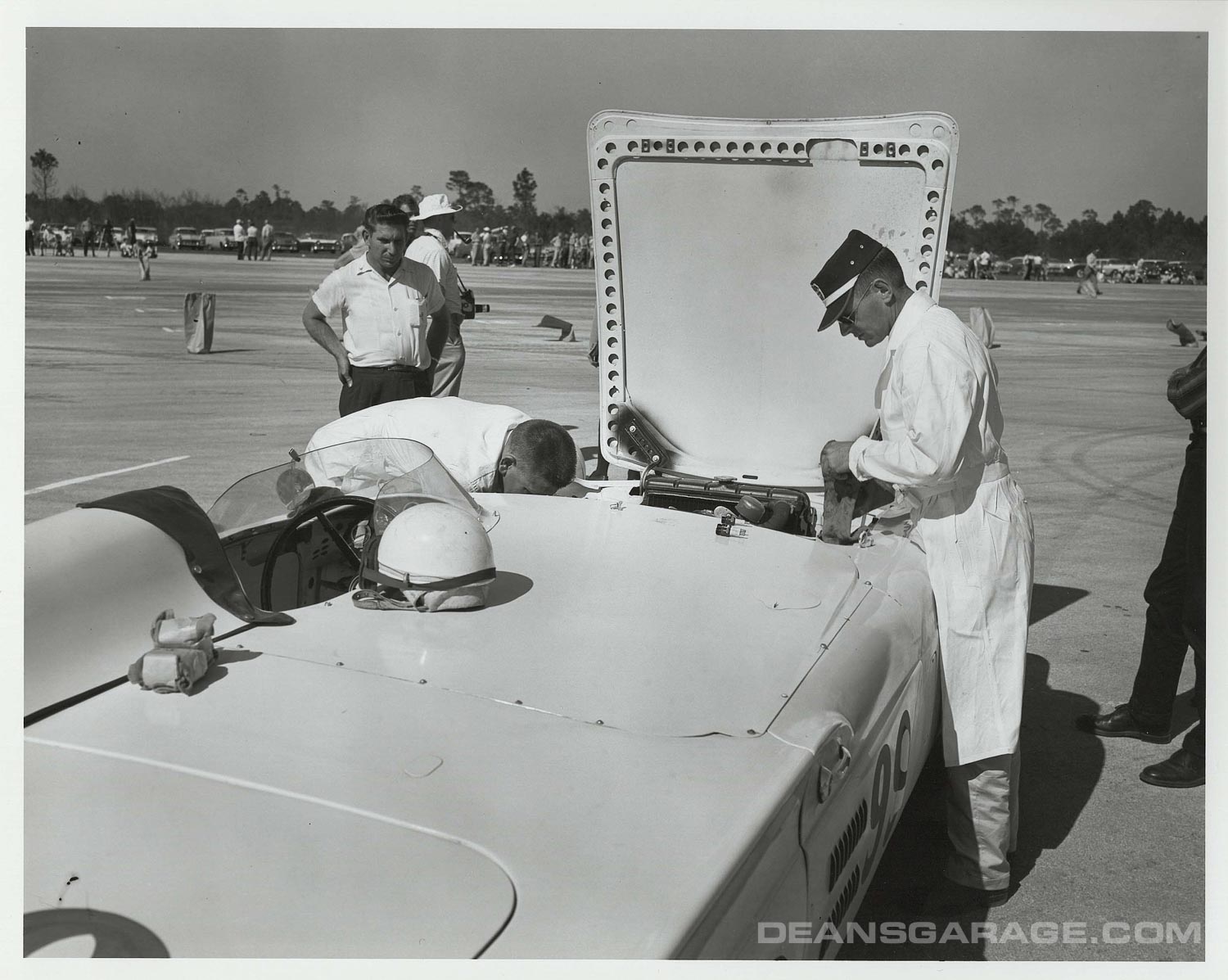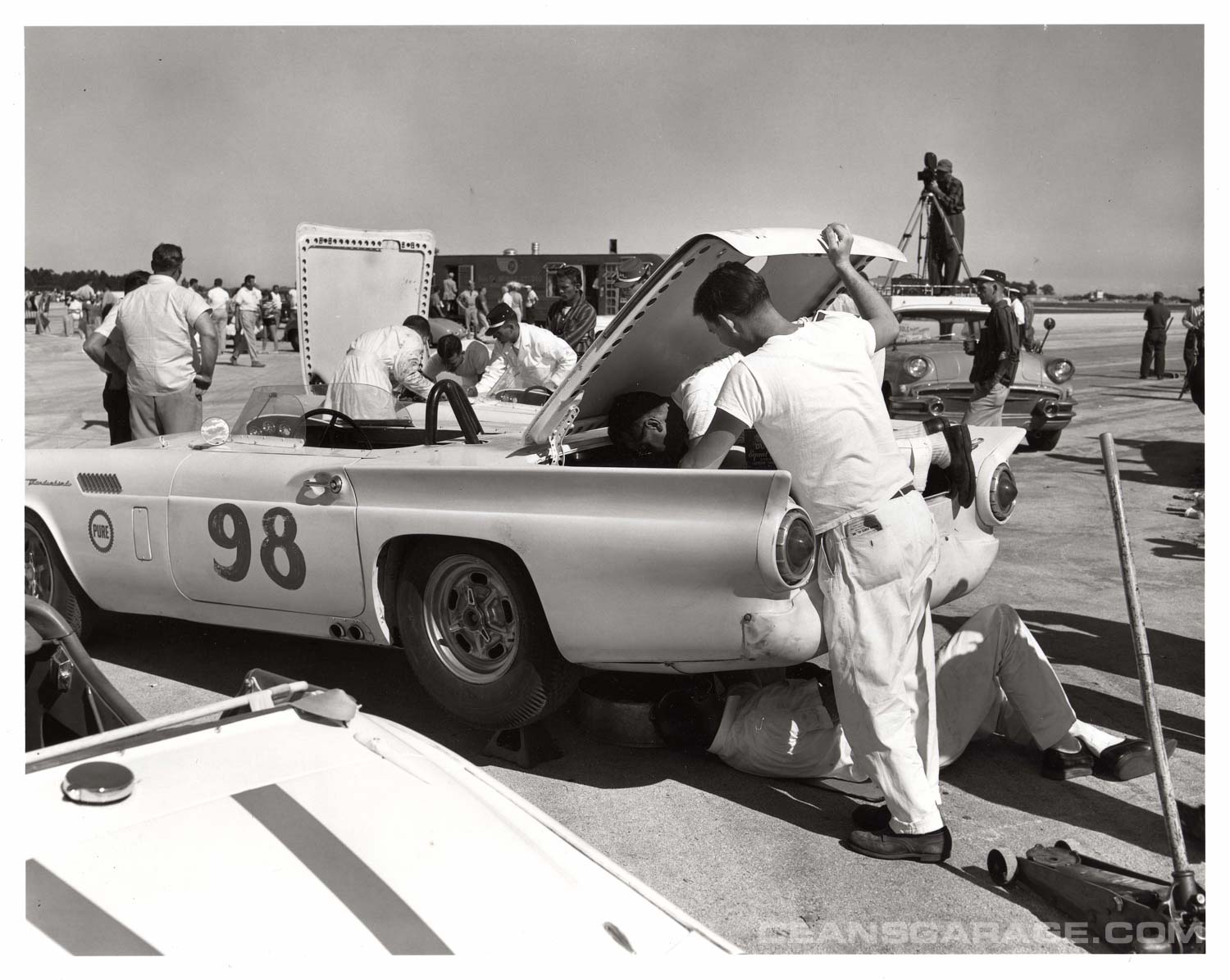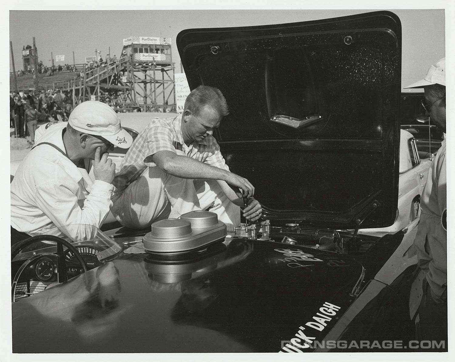 These photos are of Californian Grand Prix and sports car driver Chuck Daigh adjusting and driving a heavily modified 2×4 bbl 312 cu. in. Y-Block. Chuck started out driving Scarabs for Lance Reventlow. Chuck is in the checked shirt sitting on the fender. North turn grandstands in the background.