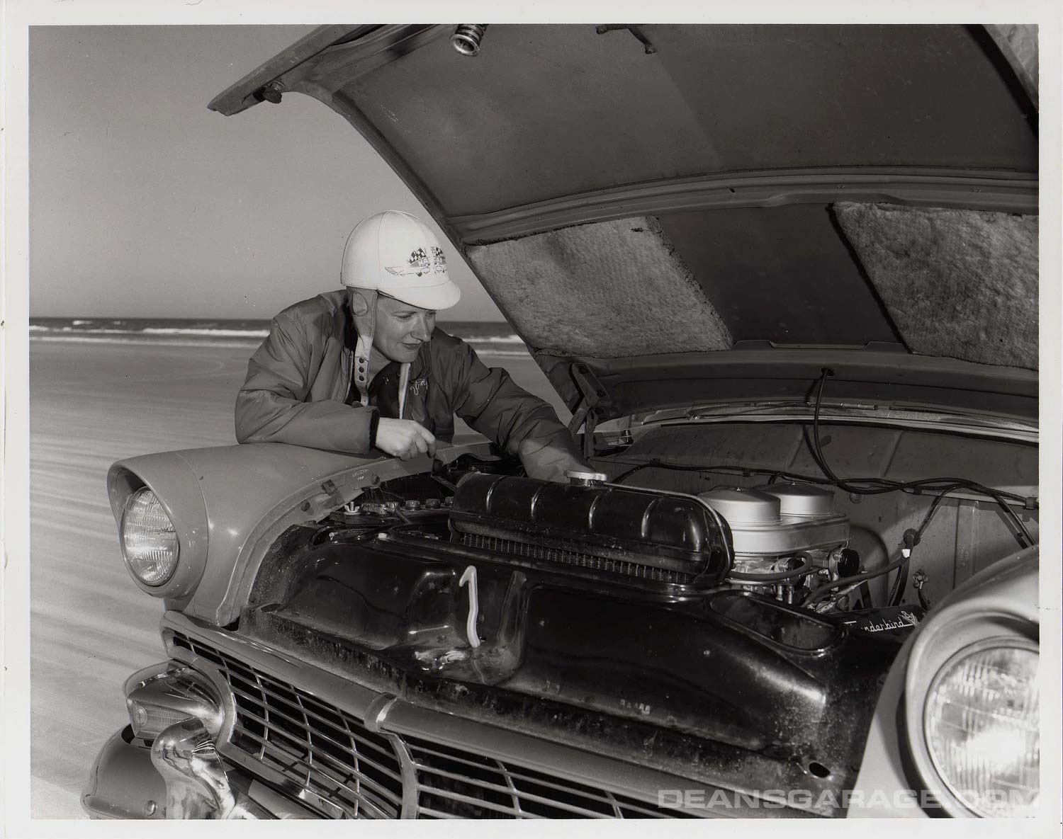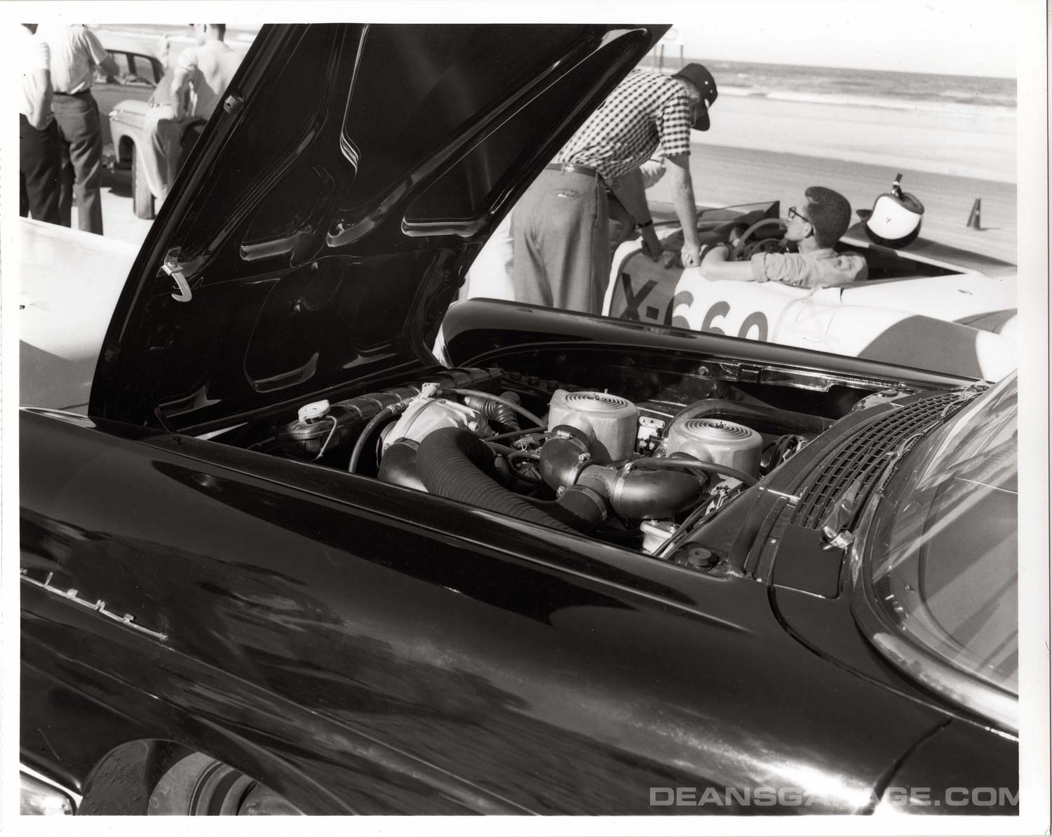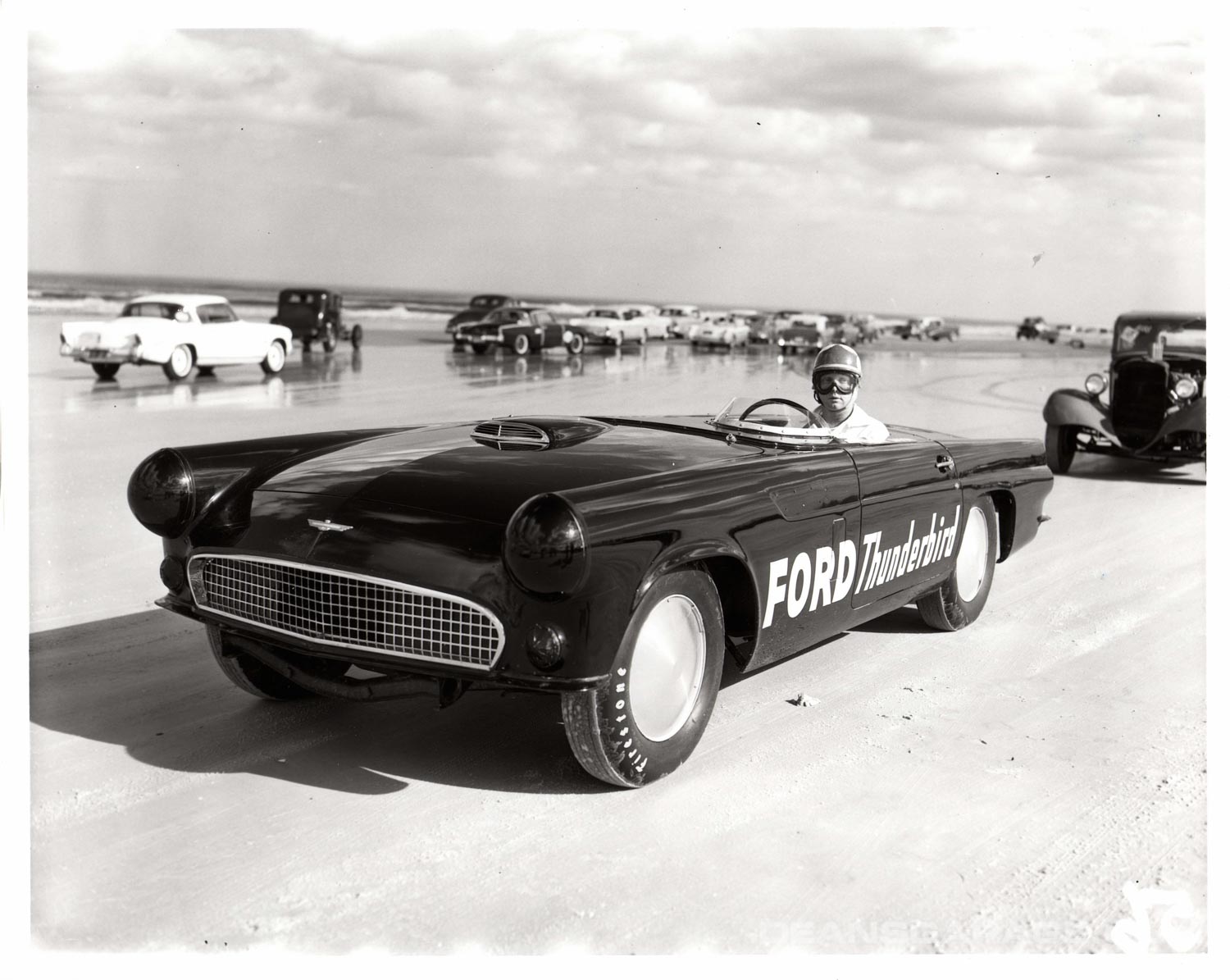 A “Battlebird” on the beach getting ready for the Flying Mile competition. Danny Eames not only drove the car, he was heavily involved in its development along with DePaulo Engineering. Eames was from Southern California and started by driving “Gow Jobs” or “Lakes” cars in the high desert. After a stint in the Marines in WWII he joined Chrysler and has involved with the Dodge and DeSoto D-500 engine program. Ford hired him away in 1955 to work on performance issues.