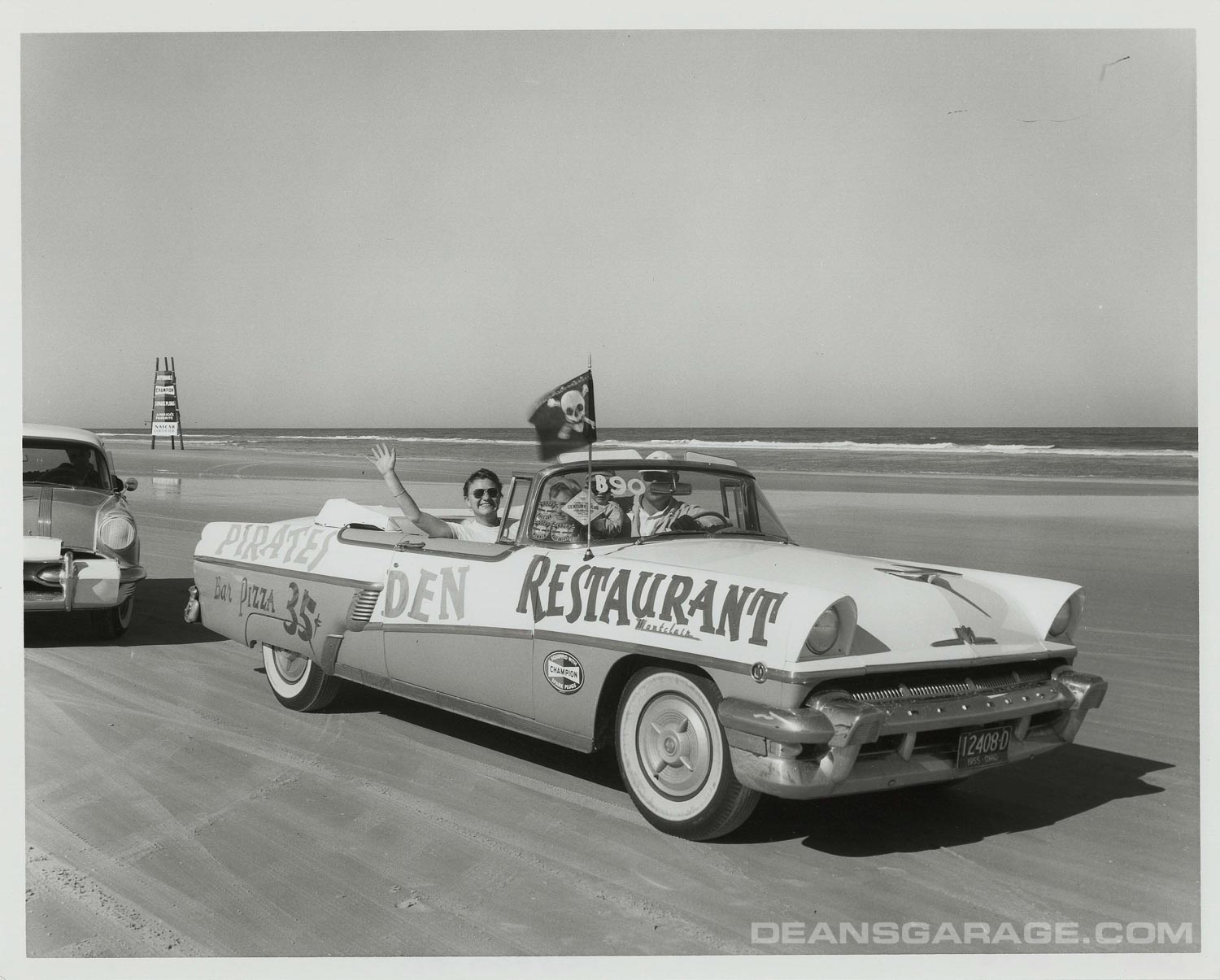 A fun shot of some spectators adverting their restaurant with the ’56 Mercury Montclair convertible. A pizza for .35 cents seems like a good deal!