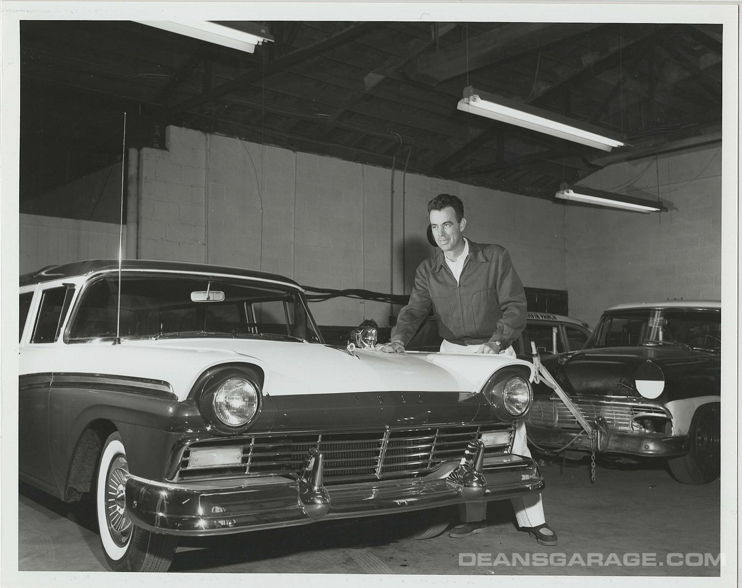 Ralph Moody of Holman-Moody fame in his shop. Compared to today’s huge NASCAR team shops, this is extremely small and primitive. You can bet that Country Sedan wagon has more than the standard 292 cu. in. Y-Block V-8! In this case a 386 Cu In ’57 Lincoln motor that was bored to over 400 cu. in.