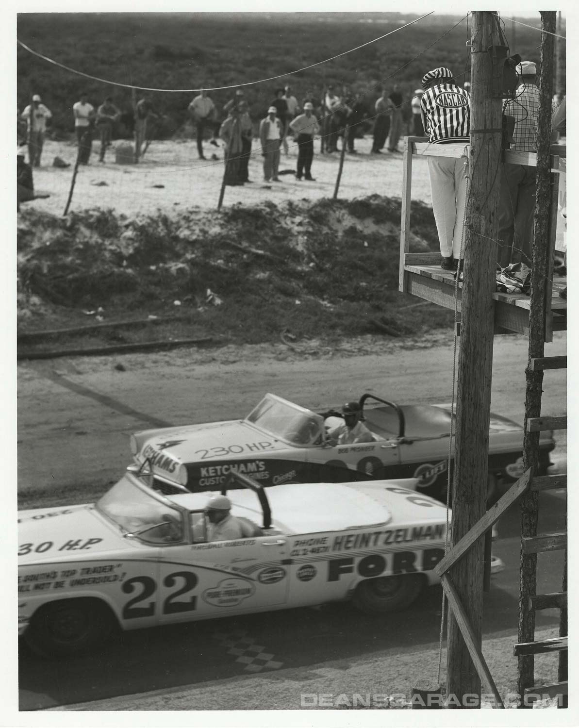 In the first shot Fireball Roberts leads Bob Pronger, both in ’56 Fairlane Sunliners. Fireball finished second in this February 25, 1956, race.