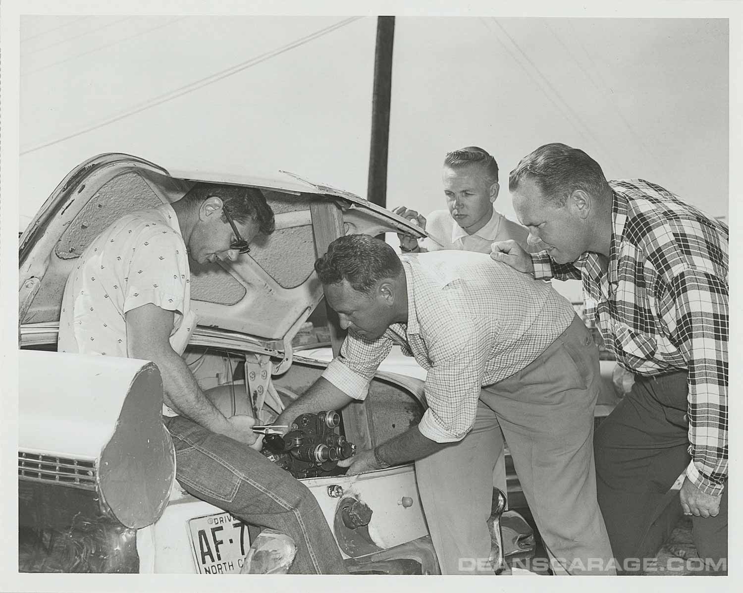In today’s races there are in-the-car cameras everywhere. This may be one of the first attempts to capture racing action from the car’s perspective. This looks to be a 16mm motion picture camera. They also mounted one behind the right-side windshield in this ’56 Ford.