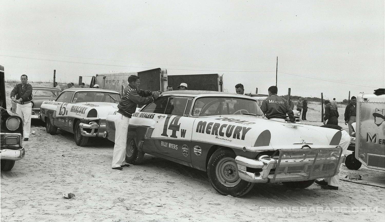 Stroppe-prepared Mercurys for the Grand National race. Billy Myers’ Mercury in front finished second in the 76-car field behind Tim Flock’s ’56 Chrysler 300B. Bob Korf in the second Mercury finished eighth. One windshield wiper with a washer to eliminate the salt spray and a bug net to protect the radiator.