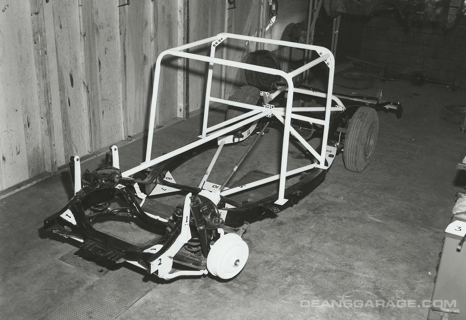 Here’s the frame of a ’57 Ford Custom 300. By today’s standards the roll cage is minimal, though a lot more than in the Convertible races. The numbered areas on the frame show where they stiffened up the frame with extra plates and gusseting. Note also that the front suspension has two very large shock absorbers on each wheel. So, the cars were no longer totally stock.