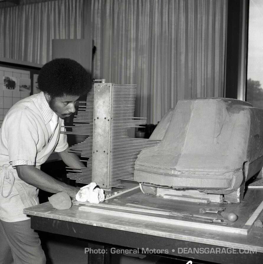 Welburn: “I first got my foot in the door at GM Design in 1971. I was fortunate to be a part of a ten-week long GM’s summer internship program. I did not attend a design college with a major in car design before, but I studied product design, sculpture, and painting at Howard University’s School in Washington D. C. They liked my work so much as an intern that they wanted me to simply complete my senior year at Howard University, and they would hire me. This happened on September 2, 1972. At the time, my student portfolio was very much inspired by the Chaparral 2H, with its sleek profile and windows on its side. I created a series of sketches of production sports cars based on that theme. I was assigned to Design Development, the studio for new hires and I may have been the last GM designer to have gone through the old ‘school’. After a month in that orientation studio, I began a one year rotation through three types of studios to see where I fit best, spending three months in each of the three studios. The first studio was Advanced Chevrolet where they were working on concepts for future Chevy sedans. Second was the production Pontiac studio where I contributed sketches for Pontiac Grand Prix, but in general given small assignments like designing a tail lamp for the 1974 Pontiac Grandville, my first production contribution. The third stop was Advanced Buick where they were working on concepts of a future Riviera for Bill Mitchell. In that first year I was way over my head. The designers around me were really good and I had so much to learn.
