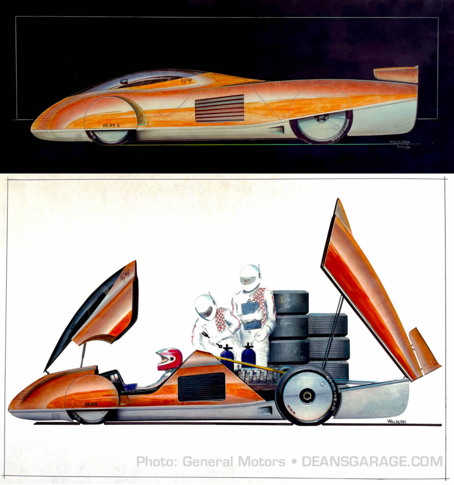 “A rumor began to circulate that one of GM Designs very confidential advanced design studios was working with GM aerodynamicists and Oldsmobile engineers on a very secretive high speed research vehicle. The car they were developing was a super low drag shape, much like the streamliners you might see at Bonneville.