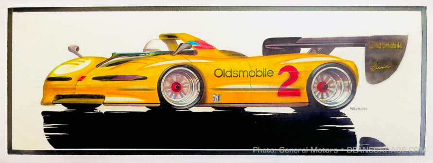 “One summer day, Len Casillo, executive design director in charge of Oldsmobile and Buick studios, stopped by my drawing desk. He had remembered seeing my Le Mans-inspired sketches on my desk and asked me to create some sketches for the secret Oldsmobile research vehicle. I was super busy working on the program to create an all new 1988 Cutlass Supreme, but I jumped at the chance to sketch on this research vehicle. I had a plan to create a series of drawings, but Casillo returned to my desk just as I completed my very first one. The sketch—dated July 14, 1984—was done in Foyt’s Coyote Orange and its wheels were skirted to reduce drag. I cautioned Casillo that I had many other ideas yet to be drawn, but he raced off with sketch number one! Apparently, all was not well with the Olds research project and a new design was urgently needed.