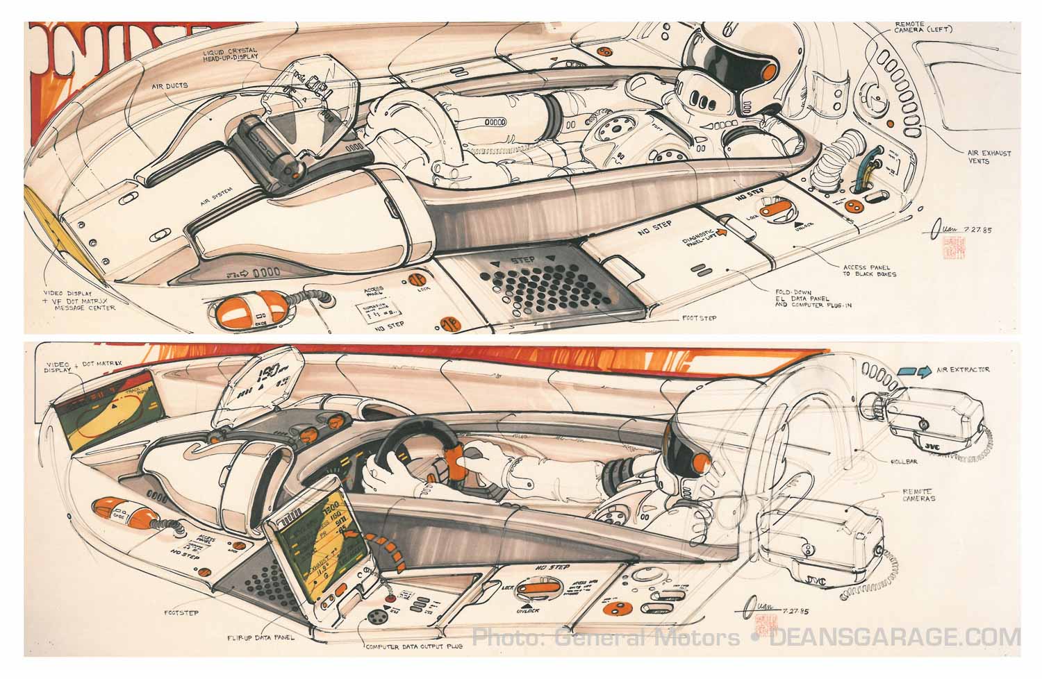 “One summer day, Len Casillo, executive design director in charge of Oldsmobile and Buick studios, stopped by my drawing desk. He had remembered seeing my Le Mans-inspired sketches on my desk and asked me to create some sketches for the secret Oldsmobile research vehicle. I was super busy working on the program to create an all new 1988 Cutlass Supreme, but I jumped at the chance to sketch on this research vehicle. I had a plan to create a series of drawings, but Casillo returned to my desk just as I completed my very first one. The sketch—dated July 14, 1984—was done in Foyt’s Coyote Orange and its wheels were skirted to reduce drag. I cautioned Casillo that I had many other ideas yet to be drawn, but he raced off with sketch number one! Apparently, all was not well with the Olds research project and a new design was urgently needed.