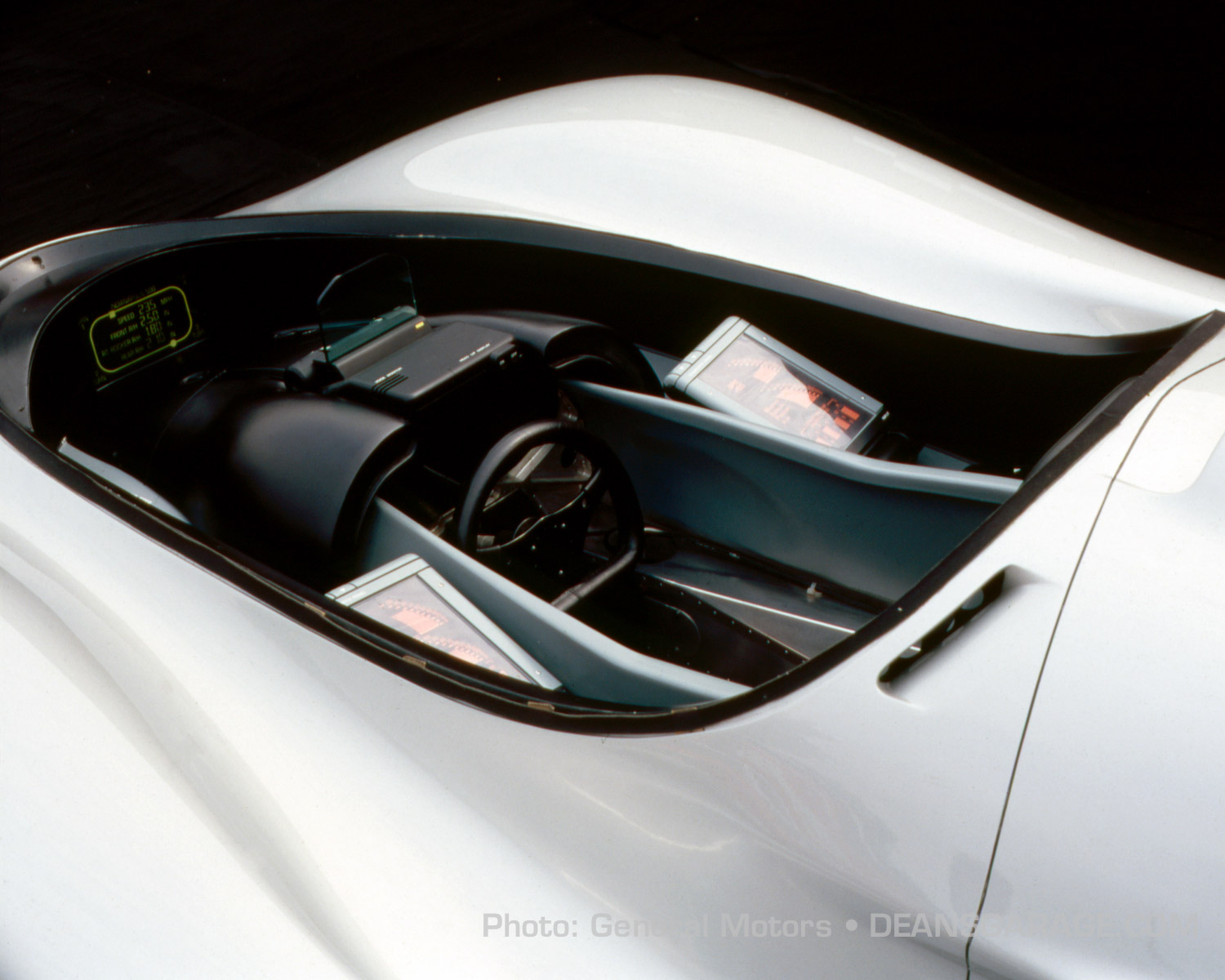 “We worked with some very progressive engineers from the GM Delco Engineering group out of California to develop the working displays. The concept of the access panels came from the requirement of the test engineers that wanted easy access to the data recordings of each lap as a way to fine tune the car’s performance for the next lap run. So on each side of the driver were two flip up display panels that were used once the car was back in the race pit. Other access panels were for equipment or access to the on-board computers. Two integrated cameras were mounted just behind the driver. Two large vents brought in air from the front nose Naca-duct.” Sadly, the use of this highly sophisticated equipment in the very lightweight record cars was finally discarded.
